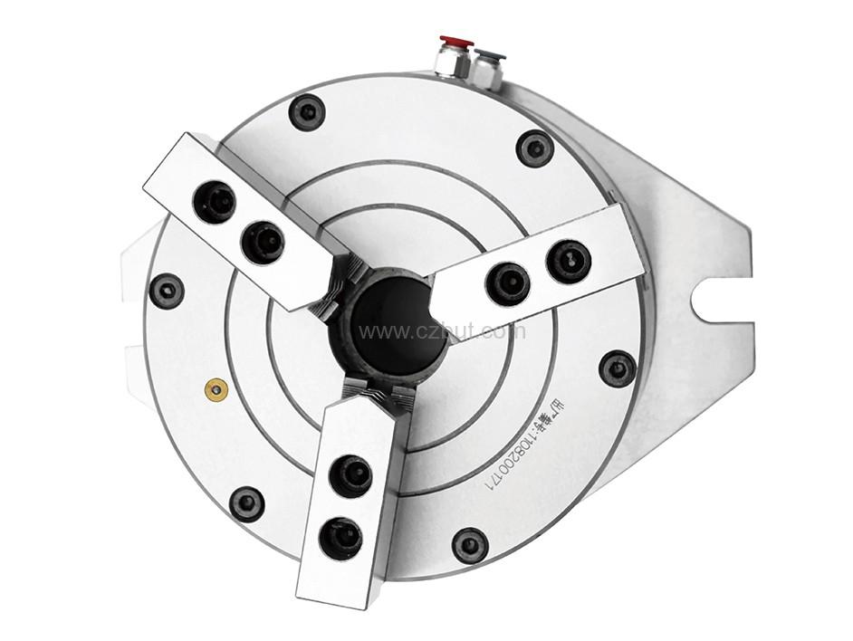 該產(chǎn)品為內(nèi)置動(dòng)力氣缸,從卡盤(pán)體側(cè)面供氣實(shí)現(xiàn)夾緊和松開(kāi),免去拉桿,中心為通孔,可穿過(guò)長(zhǎng)軸棒料,適用于鉆床、銑床、加工中心等設(shè)備。