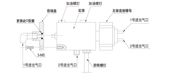 5、如果在使用時(shí)發(fā)現(xiàn)夾緊工件產(chǎn)生漏氣量較大的情況,請(qǐng)更換小O型圈,將前端蓋3-M5螺釘拆除,換下在前端蓋中孔內(nèi)的小O型圈(規(guī)格d9×1.8氟橡膠,如購(gòu)買不到,請(qǐng)與我公司聯(lián)系),然后再將前端蓋旋緊于原來的狀態(tài),見示意圖;